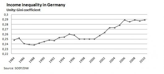 Giustamente, però, Claudio Martini e Luciano Gallino ci ricordano che questa storia ha un rovescio della medaglia, che risponde appunto al nome di immiserising growth: "C'è un Paese in Europa che ha sofferto, negli ultimi anni, di una vera e propria sindrome da bassa crescita. Un Paese nel quale gli stipendi stagnano, quando non si riducono, e sopratutto perdono terreno rispetto alla produttività del lavoro. Un Paese dove i lavoratori e i pensionati sono stati costretti a rinunciare a molto di quello che avevano conquistato. Un Paese dove le disuguaglianze non fanno che aumentare, i ricchi sono sempre più ricchi e la povertà dilaga". Questo Paese è proprio la Germania, come mostrano due studi sulla povertà urbana in Germania e sulla diseguaglianza nella distribuzione del reddito. Peraltro, l'aumento della diseguaglianza in Germania ci dice molte cose sul "modello tedesco":