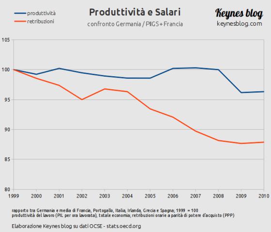 Così come è significativo l'andamento di salari e produttività (rapportando Germania ai PIGS+Francia):