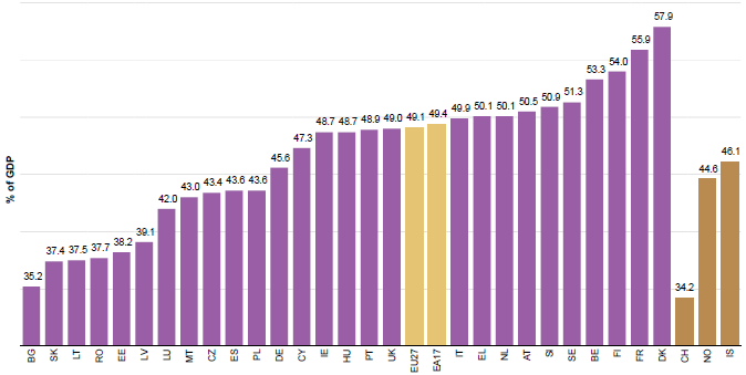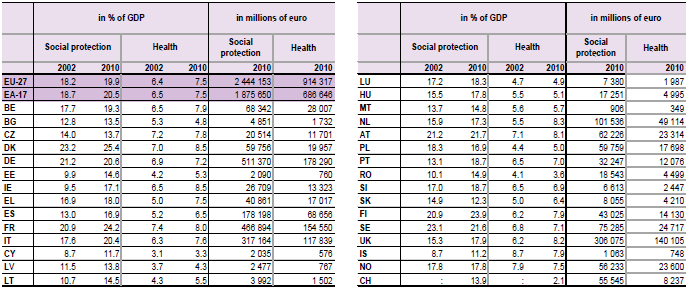 Mediamente, in Europa (UE a 27), più di metà di quella spesa (54.7%) è "sociale" – ora comunemente chiamata welfare –, ovvero copre spese per la protezione sociale e sanità. L'Italia, nel contesto europeo non fa "peggio" degli altri e non è nemmeno particolarmente generosa. La tabella qui sotto, dalla stessa fonte Eurostat, è illustrativa. Tra il 2002 e il 2010, la spesa per protezione sociale in Italia è passata dal 17.6 al 20.4 per cento, in linea con la media dell'Eurozona e inferiore a Danimarca, Francia, Finlandia, Svezia, Austria e persino Germania. Questa voce include sussidi alla disoccupazione e alla famiglia, sussidi di povertà ed altri benefici, oltre alla spesa per pensioni. La spesa sanitaria, nello stesso periodo, è cresciuta di poco più di un punto percentuale, passando dal 6.3 al 7.6 per cento del PIL, in linea con la media e inferiore a quella di molti Paesi.