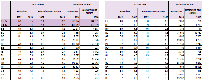La spesa per sussidi alle imprese, infrastrutture e altre voci economiche tra il 2002 e il 2010 è invece scesa, in Italia, dal 4.1 al 3.8 per cento del PIL, mentre la media UE è aumentata dal 4.2 al 4.9. Lo stesso dicasi per la spesa per istruzione e cultura, che nello stesso periodo è passata dal 5.6 al 5.3 per cento del PIL, contro una media europea in aumento dal 6.3 al 6.8 per cento del PIL.